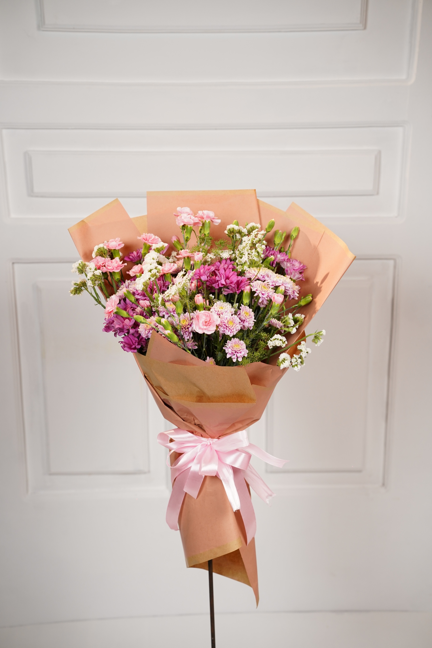 Chrysanthemums 10, Carnations 8, Statice 3, Lady Lace 2
